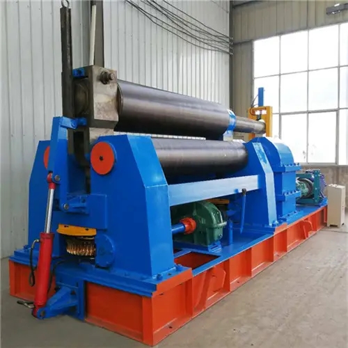 3.液压三辊卷板机适用于金属板的弯曲变形,可在一定范围内卷绕圆、弧、锥形工件,具有板端预弯功能,两个主动辊可水平移动,上辊可上下移动,机械液压,传动轴采用通用连接器连接。